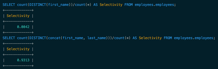 索引的选择度(Selectivity),指未重复的索引值(也称为基数,Cardinality)与表记录数(TotalSize)的比值:Index Selectivity = Cardinality / TotalSize,选择性范围是(0, 1],选择性越高,指数的值就越大(唯一具有选择性1的指数)。如下,单纯用first_name字段索引的选择性很低(0.0042),将first_name和last_nam做一个联合索引,很明显,选择性是好的。