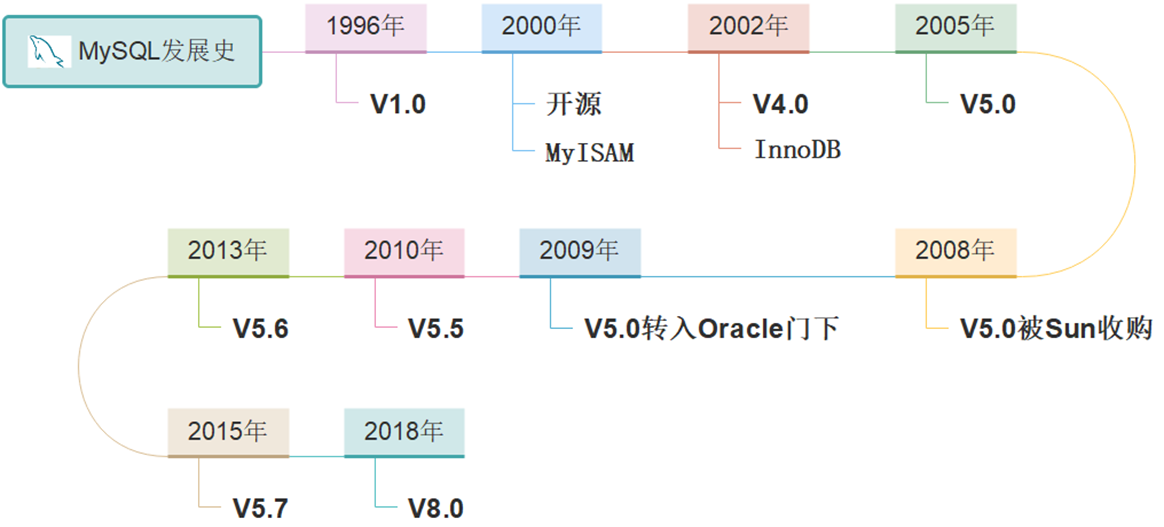MySQL源自MySQL AB公司的前身ISAM和mSQL项目,第一版于1996年发布,当时只支持SQL特性,没有事务支持。在200年,MySQL发布自己的源代码,及GPL许可协议,正式进入开源世界。2000年4月,MySQL已经组织了旧的存储引擎,它的名字是MyISAM。