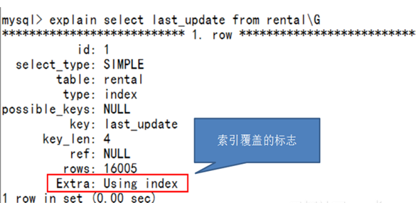 验证SQL是否实现了索引覆盖,通过解释可以查看额外属性,如果用于使用索引的额外显示,它表明SQL已经实现索引覆盖。注意,只有当查询声明访问的列是索引的一部分时,索引才会覆盖,当然包括主键,因为主键也是辅助索引中.