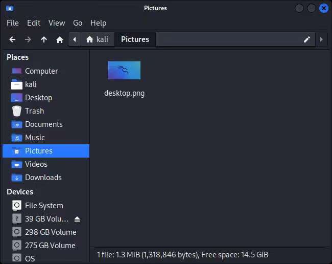 重启计算机,从优盘引导启动,进入卡利桌面环境后,将桌面截图,将剪切文件命名为 desktop.png,保存到/home/kali/Pictures路径。再次重启计算机,参见 /home/kali/ Pictures,你可以看到先前保存的桌面快照文件,如下图: