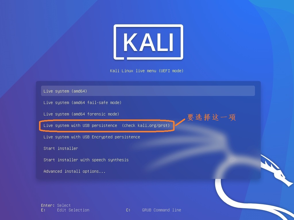 从启动盘启动计算机,注意,您可能需要先修改您的电脑的UEFI设置,将 Secure Boot 选项关闭。在卡利的菜单选择中,选择“Live system with USB persistence”。如下图: