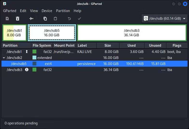 在这里可以看到卷标为persistence、格式类型为 Ext4 的磁盘分区名称是 /dev/sdb5 。关闭 GParted 软件窗口,打开一个终端窗口,依次执行以下命令: