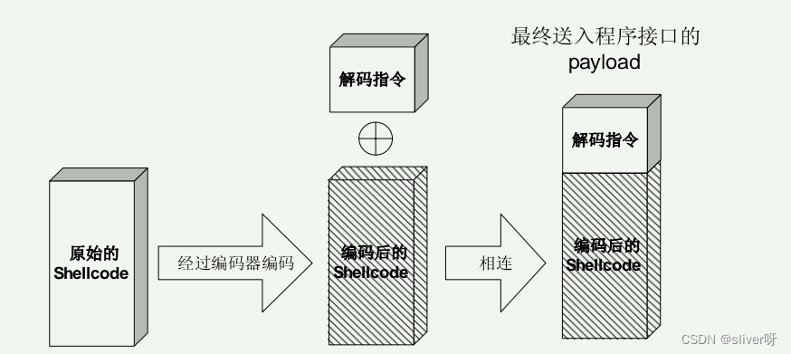 方法: 用编码技术编码壳代码,使它符合限度的要求,再构造解码程序,将它放在shellcode开始执行的地方。当探险成功时,首先运行shellcode顶部的解码程序,它将恢复壳牌代码到原来的状态。示意图如下: