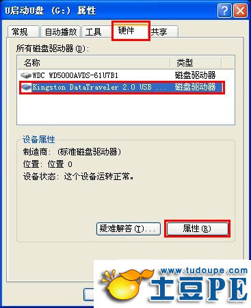 然后选择u盘,点击鼠标右键找到属性选项,找到依照如下图所示红色方框处标记找出硬件窗口栏,在磁盘驱动器列表中选择我们所插入的u盘,接着点击下方的属性按钮即可
