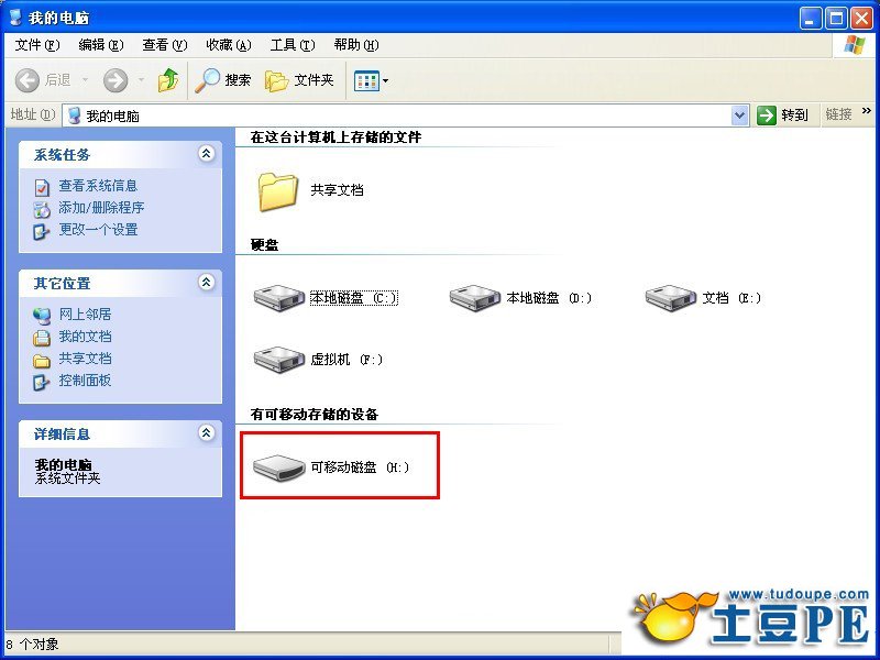 首先,我们先将所要是用u盘的电脑中的自动播放功能进行关闭,详细方法可参考小编之前在u盘常识栏目所发布的“如何禁止插入u盘时的自动播放功能”方法进行关闭。随后将已经感染u盘病毒的u盘插入到电脑usb插口处,接着打开我的电脑,查阅并记住u盘在电脑中所对应的盘符信息。如下图所示:
