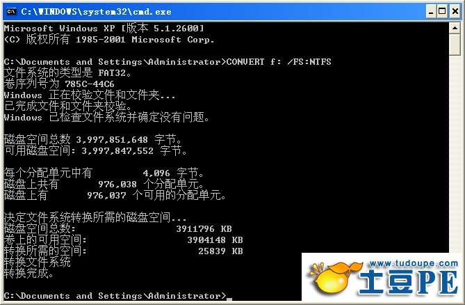 之后键入CONVERT X: /FS:NTFS,其中X代表的是你U盘目前所代表的盘符,按下回车后会看到如下画面:
