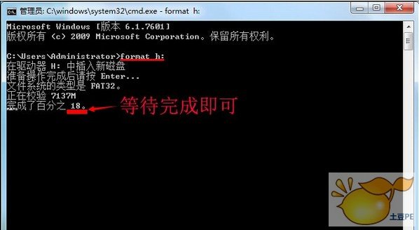 2、在弹出的dos命令窗口中光标处输入“format h:”(注意: h 是空格加一个h,而h表示你U盘的盘符。),按回车键后,耐心等待格式化即可,如下图所示: