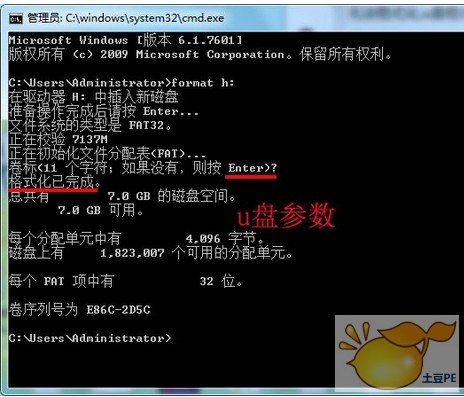 3、格式化完成后,按Enter显示格式化已完成,并列出U盘格式化的一些相关参数信息。如下图所示: