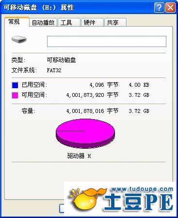 如上图所示这就是小编在电脑城所买来的u盘,上面的信息显示u盘容量只有3.72gb的大小,跟我们实际买来的4g容量相差了接近0.3gb。产生我们眼前所看到的情况,其实是u盘的制作厂商制作u盘时参照的容量换算单位与我们使用的电脑容量换算单位不大一样。u盘的制作厂商是使用1gb=1000mb进行换算,而我们电脑系统则是按照1gb=1024mb进行换算,所以造成我们所买回来的u盘实际容量不是我们表面上所见到的容量大小,就造成了我们今天所产生的误会。土豆PE在此建议您,购买u盘时,请直接到正规店面上进行选购,勿因贪小便宜而吃大亏买到了假u盘哦!