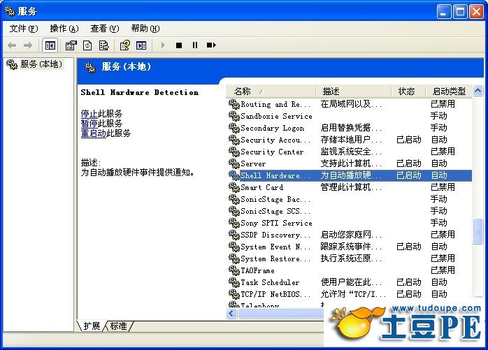 打开桌面左下角“开始”菜单,依次打开“控制面板—管理工具—服务”选项,如下图显示寻找一项服务名称为“Shell Hardware Detection”