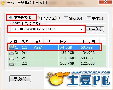 3、插入之前先制作好U盘PE系统,重启电脑,进入PE系统后,点击桌面上的土豆一键重装系统工具,将WIN7.GHO文件安装到C盘就可以了,如下所示: