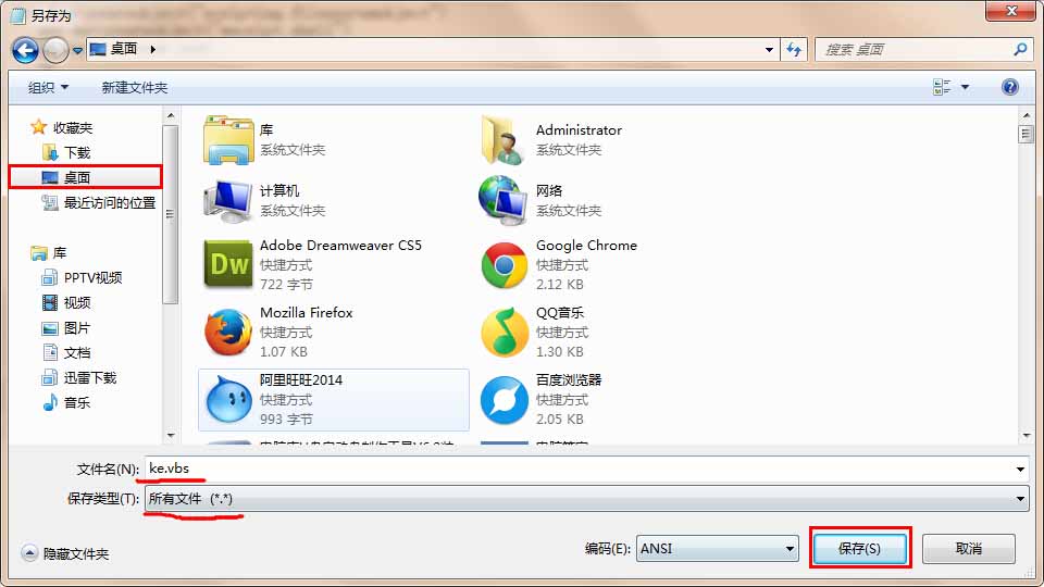 3、在弹出的另存为窗口中,先点击左侧“桌面”,然后把保存类型设置为“所有文件(*.*)”,文件名设置为“ke.vbs”,接着点击“保存”按钮,如下图所示: