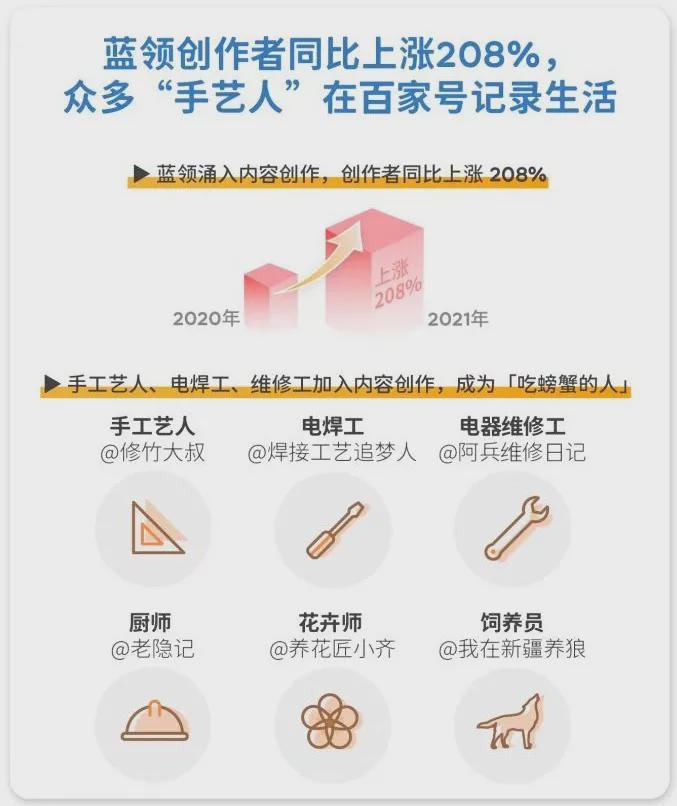 士兵和小琪的情况并非罕见,《Chiron》报智囊团和第100议院联合发布的关于2021年内容制作人生存情况的研究表明,在2020年9月至2021年9月的100个家庭周期中,非常需要具有专业背景的实用一般知识,蓝领代表的创作者人数增加了208%。 手工艺者、焊接者、电动维修工人、厨师、花匠和育种者等在记录其生活的同时赚取第二笔收入。