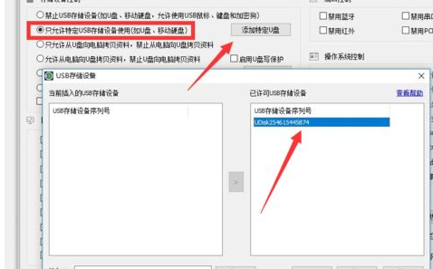 勾选“只准许特殊的usb存储设备应用”,与此同时点一下右边的“添加特殊U盘”按键,这时就可以对特殊开展浏览的U盘开展添加操作了。