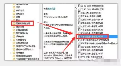 进行左边的支系列表,选中“可移动存储设备”选项,随后在右边寻找“可移动机器设备,回绝载入操作”选项,并双击鼠标进到编辑状态。