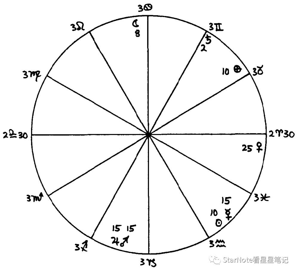 上升位于天秤座2度30分,月亮位于巨蟹座8度4分,土星位于双子座2度,木星位于射手座15度,太阳位于水瓶座10度,火星位于射手座15度,金星位于双鱼座25度,水星位于水瓶座15度,福点位于金牛座10度。命主夜生,从月亮的三分主观其运势。第一三分主为火星,第二三分主为金星,于3、6果宫,象征着命主不好的环境。但月亮,区分光体位于天顶,亦为其自身三分主;福点位于金星星座;象征着命主命终时美好的条件。