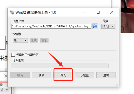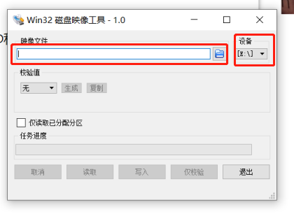 第四步:打开WIN32磁盘镜像助手,映像文件选择刚刚修改的img文件,设备选择U盘
