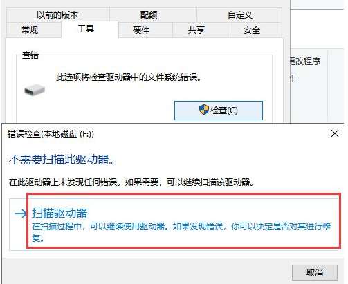 2、在弹出的错误检查窗口中点击“扫描驱动器”,这时候系统会自动修复文件系统错误和扫描并尝试恢复坏扇区,修复完成后再打开u盘看下是否还显示需要格式化,不显示的话就说明u盘正常了。