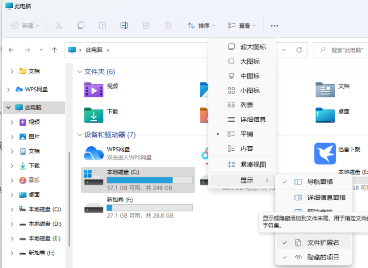 (1)win11为例,查看-显示-文件拓展名,点击,显示打钩就行