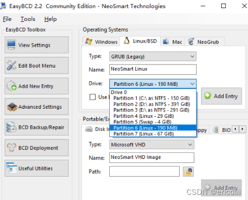 点击“Add New Entry”,点击“Linux/BSD”,选择“Type:Grub legacy”,