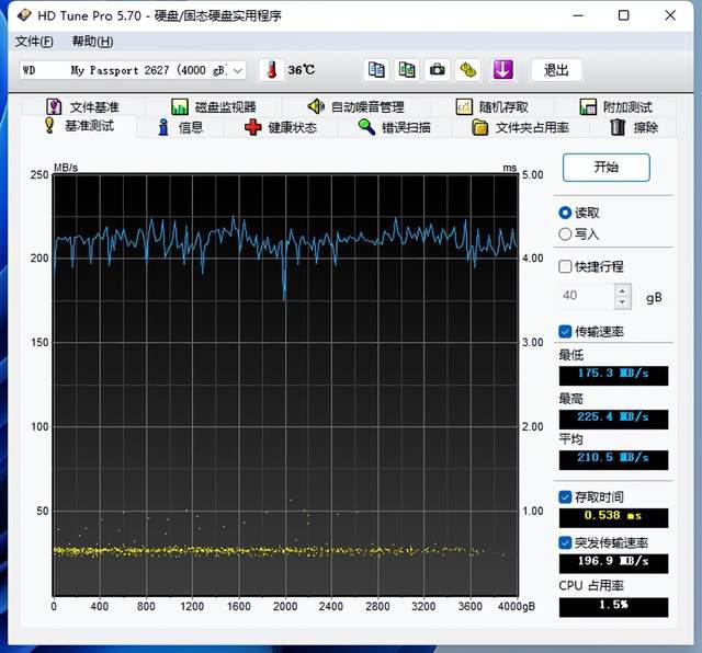 在HD Tune Pro测试软件中,可以看到移动磁盘的容量为3726G(计算为100M=1G),在测试中,可以看到传输速度不慢。