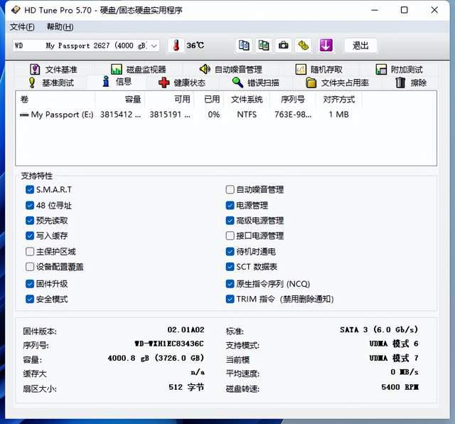 在CrystalDiskInfo应用程序中,可以看到移动盘的测量4TB容量的一些参数是没有问题,可以看到它的功率时间,数目等,通过参数可以有更详细的理解移动盘。