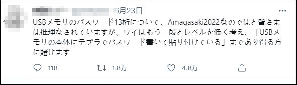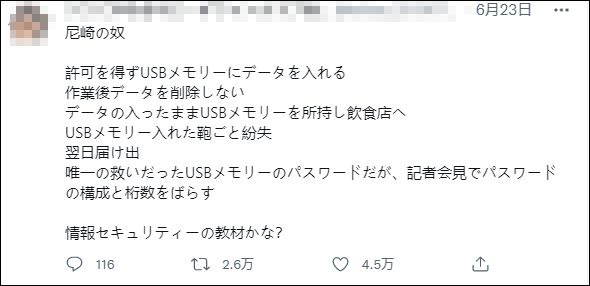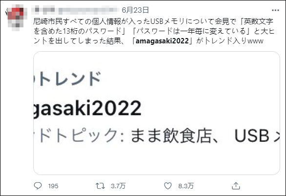 这引起了日本网民的批评。这个话题的热量也很高,它在日本Twitter的流行趋势榜上排名第一。许多日本网民对尼崎市缺乏安全意识感到愤怒。“在新闻发布会上,宣布了U磁盘密码的数量..为什么??”这是信息安全课本 吗?