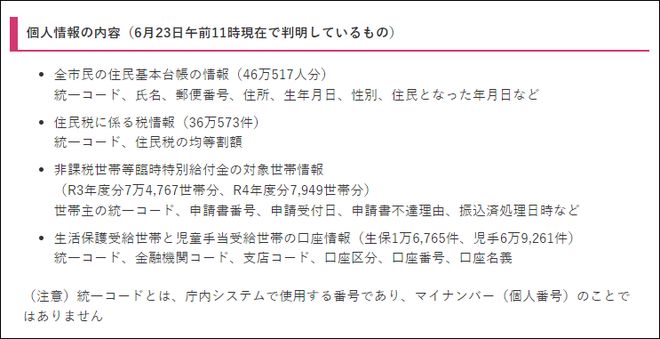 尼崎市政府通报称,所列资料包括二崎市居民460517人登记的基本资料、360573人纳税资料、82716人为2021年及2022年特别福利受援者家庭的资料、及第86062条为领取公共援助和儿童福利的家庭提供帐户资料。