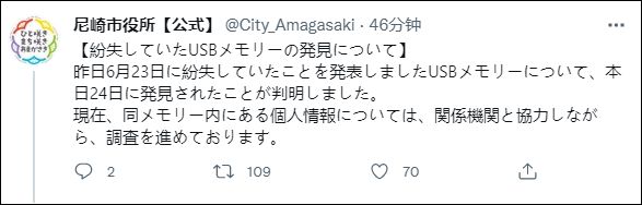 6月23日,日本兵庫県西崎市举行记者招待会,宣布在6月21日丢失了载有4,600万市民个人资料的U磁盘。然而,U磁盘故障仍然未知,但西崎市发言人在记者招待会上道歉,透露了U磁盘密码的位数和组成部分。