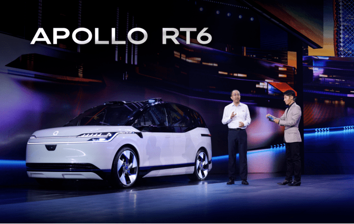 百度集团高级副总裁兼智能驾驶业务集团(IDG)总经理李善玉发布阿波罗RT6(左)