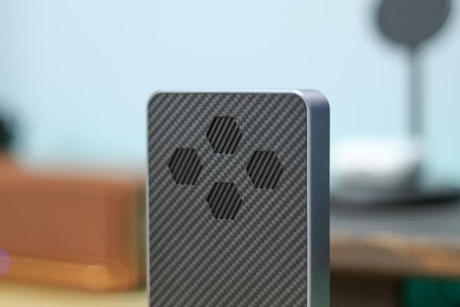 在扩建码头的前面是产品LOGO,设计了四个蜂窝类似的装饰图标,其余的覆盖了磨砂表面类似碳纤维材料,手感非常好,不难染指纹和污点,结合铝合金的主要材料,热耗效应也更好。