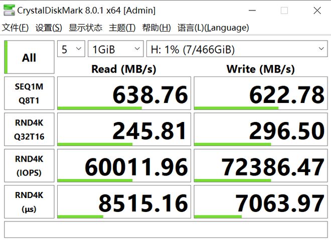 不要按照国际惯例在实践中表现得很好,或者首先测试波浪,这里我使用了熟悉的 CrystalDiskMark来测试,你可以在USB3.2中看到aigo U396的固态U磁盘。在接口下的测试写字速度达到了622.78MB/s,读取速度达到638.76MB/s,实际的测试速度比官方宣布的600MB/s快。这直接解决了我开始谈论的两个问题——方便和速度问题,实际上是U磁盘体积,固态速度,这是我最关心的两个事情之一。