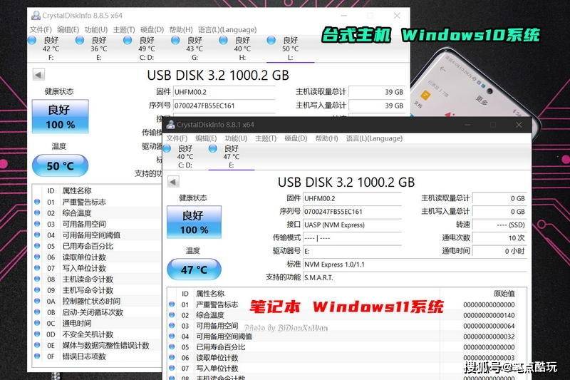 下图分别为在笔记本和台式主机上使用CrystalDiskInfo识别的SSD信息(我的台式机系统留在Win10专业版,笔记本升级到了Win11)。