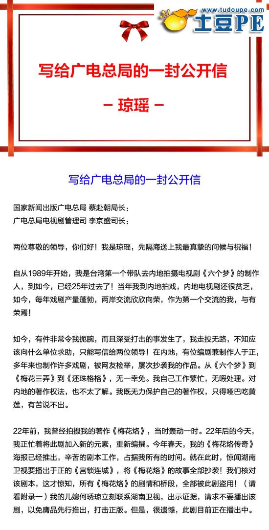 “我想,关于此剧抄袭种种,公道自在人心,我提供的资料已经很完整,不知道两位领导,可否让这部抄袭侵权的作品,即时停止播出……”
