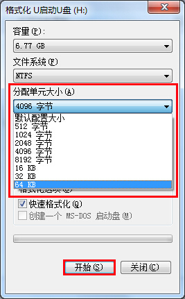 3、选择好U盘格式后,选择分配单元大小,设置为64KB,取消掉快速格式化的勾,然后点击“开始”按钮,格式化u盘启动,如下图所示: