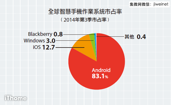 从各区域来看,新兴市场成长较为显着,其中东欧、中东及非洲地区在2014年第三季的智慧手机销售量较前一年同期成长近50%,成长率最高,成熟市场中则以美国的18.9%成长率为最高,主要原因来自于iPhones 6和6 Plus的上市。在智慧手机的作业系统方面,Android及iOS皆持续成长,市占率分别为为83.1%、12.7%,Windows、Blackberry两者市占率则分别滑落至3%、0.8%。