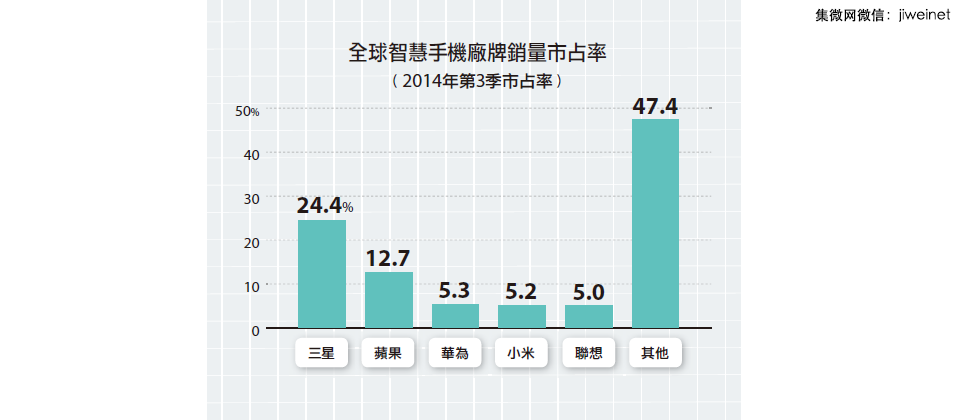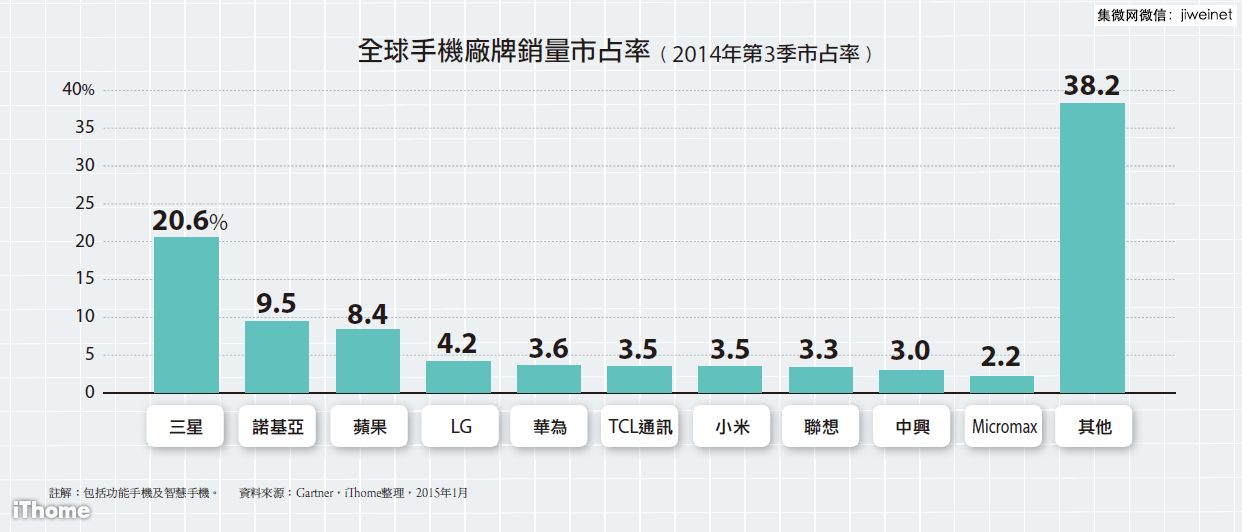 在智慧手机的部分,三星以24.4%为最高市占率,相较前一年同期下滑了7.7%,苹果市占则有些微成长,位居第二大市占厂牌,这两大智慧手机厂牌市占合计为37%,较前一年同期下滑了7%。Gartner指出,三星的功能手机与智慧手机销售量在2014年第三季皆下滑,其中,功能手机较前一年同期减少10.8%。另外,三星最主要的中国市场下滑了28.6%,在西欧及亚洲地区的需求成长力道薄弱。
