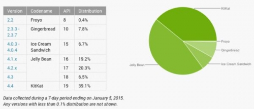 据国外媒体报道,谷歌近期给出了Android版本使用报告,调查数据显示,截止2015年1月5日,4.1.X Jelly Bean版Android系统和4.4 KitKat版Android仍是市面上使用最多的Android版本。其中,Android 4.4 KitKat凭借39.1%的使用率,成为当之无愧的Android系统王牌版本。而回顾KitKat版系统下载开放初期,4周就达到1.1%的市场安装份额,KitKat受欢迎的程度也能略见一斑。相比之下,新出最新版Android 5.0 Lollipop,其市场份额甚至低于0.1%的数据标注限,一度致使其在饼状统计表中无法体现。