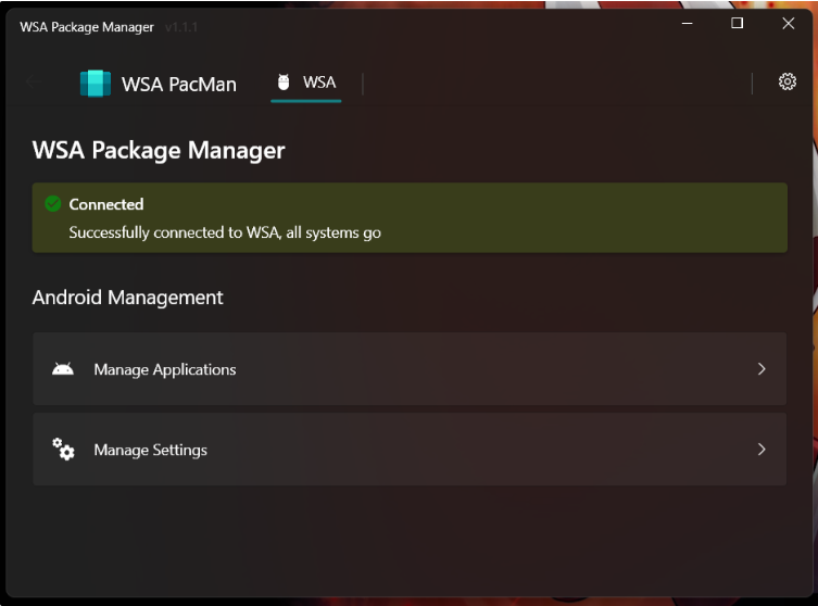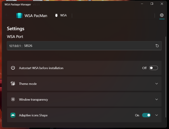 WSA Pacman, 如图所示, 包括云母效应, 允许亮/ 暗主题, 并绑定 APK 后缀文件 。 Win11 用户可以双击 APK 文件来应用 。