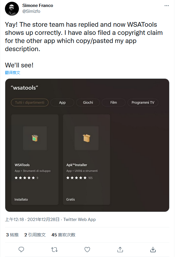 在媒体报导一个名为“ApkInstaller”(Micromicro Store)的假节目被放在架子上后,Simone Franco是WSATools的创始人,这是我国历史上首次将应用程序从市场上移除。微软已被告知伪应用的问题。微软仓库团队似乎收到了开发商对此问题的投入。有人试图纠正这个问题。