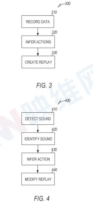 图4中的400个流程图说明了外推额外行动的程序。在操作410,记录的数据与个人的声音有关。例如,在一系列真实事件中,锤子敲响了物体的声音。或者,可以观察到锤子造成的振动。特定声音、振动或两者都可被确认为与已知420度活动有关。在操作430,公认的声音或振动,或两者兼而有之,被用来作出推断。在操作440处,为了反映外推活动,可以更新改进的重播。