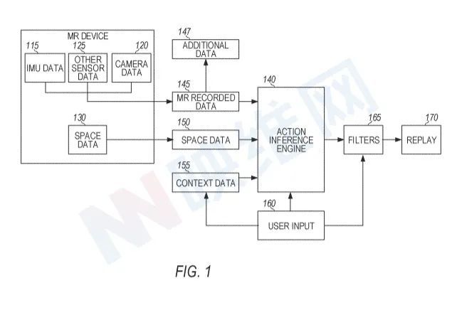 图1显示一个100个系统框,用于对用户记录MR经验进行动画描述。MR设备110用来记录许多种类的数据。例如,IMU数据115、相机数据120和其他数据125。MR 头部显示器中的商业惰性传感器可以提供IMU数据。IMU数据通常包括代表六种惯性运动自由的数据。这包括向左、右、前、后、上、下移动。视频和深度数据可列入相机数据120。从麦克风、用户眼睛跟踪信息以及温度等其他数据收集到的声音是传感器数据的例子。在另一个执行实例中,还可以使用传感器收集心率和其他生理数据。