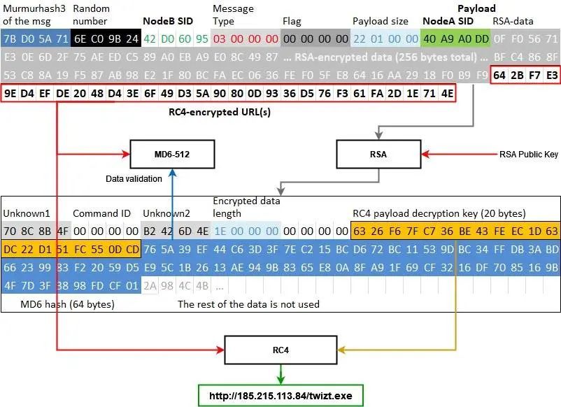 使用MD6-512修改算法,Twizt 从以 RC4 加密的 URL (在上图中以红色显示) 中得出64 位Hashi 值 。并将其与RSA加密数据参考值进行比较如果值不相等,则不执行该命令。
