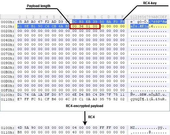 使用 RC4 键在信头中, 我们可以解码有效载荷: