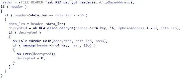 有效载荷下载后,这将保存原始加密 。要将文件内容映射为内存,恶意程序使用 CreateFileMapping/MapViewofFile 函数。文件的头256字节是登记册系统管理人的加密信头。有效载荷数据使用信头16byte RC4密钥进行解密。