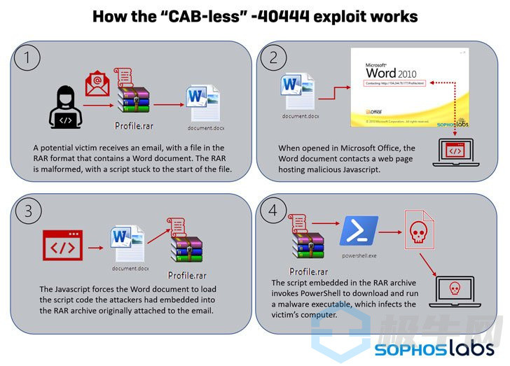CAB-less 40444,这是对“渗漏准入方案”的更新。它在10月24日和25日之间持续了36小时。在此期间,潜在受害者获得垃圾邮件,包括结构不正确的RAR档案档案。反过来,使用 Windows 脚本主机 (WSH) 开发的脚本和 Word 文档包含在 RAR 文件中 。此文档将与位于远程站点的恶意 JavaScript 打开 。