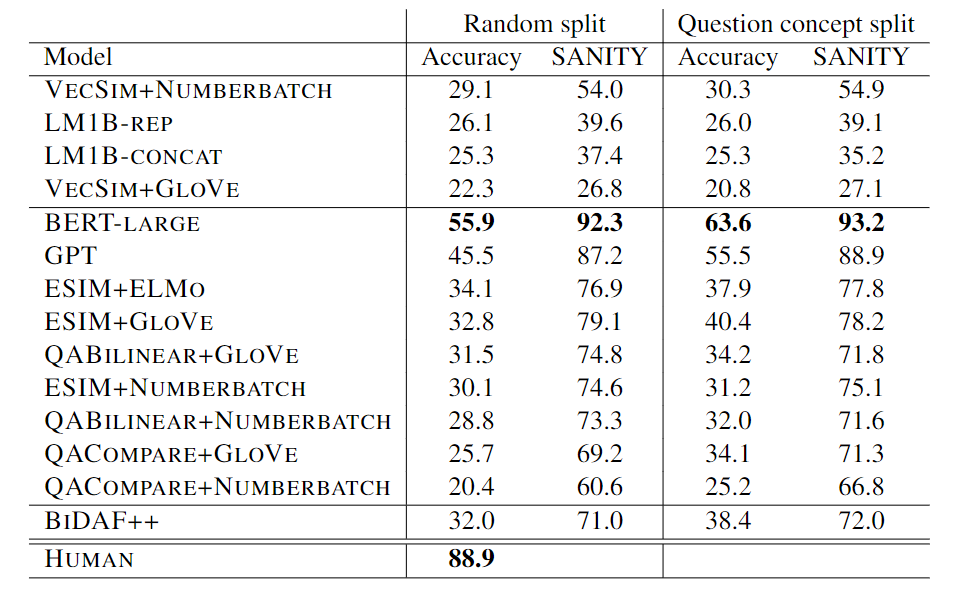 共同enseQA的创建者随后测试了Bert-Large模型,该模型当时贯穿了主要排名,准确率仅为55%.9%,而人类回答率为88.9%。