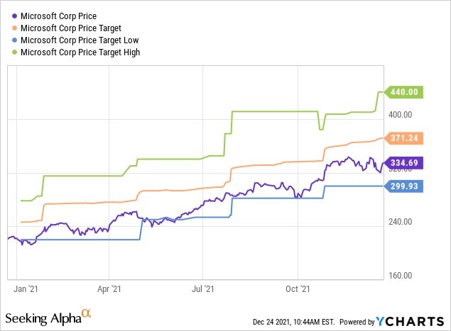首先,考虑一下华尔街对微软未来一年股票价格模式的一些看法: