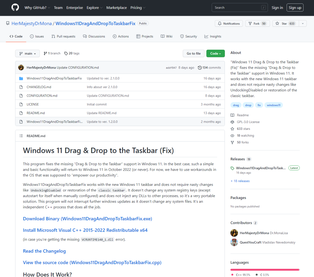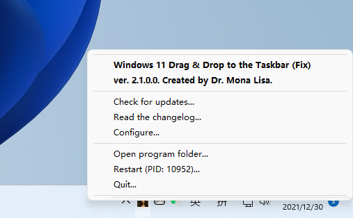 这款程序名为“Windows 11 Drag & Drop to the Taskbar (Fix)”,它已经开始在吉特Hub上。蒙娜丽莎博士(蒙娜丽莎博士)是开发商的代言人。运行小工具之后,它将以任务栏右下角的托盘为基础。