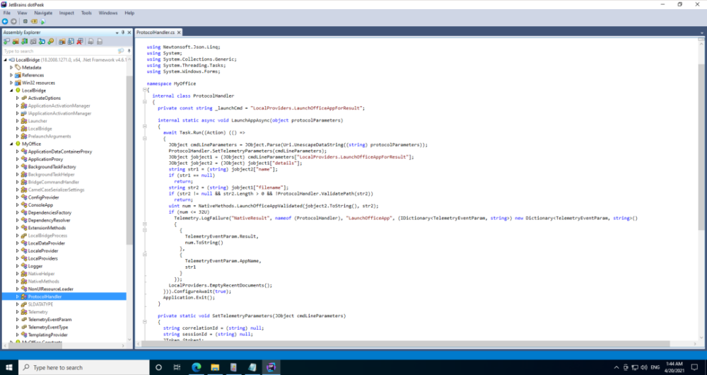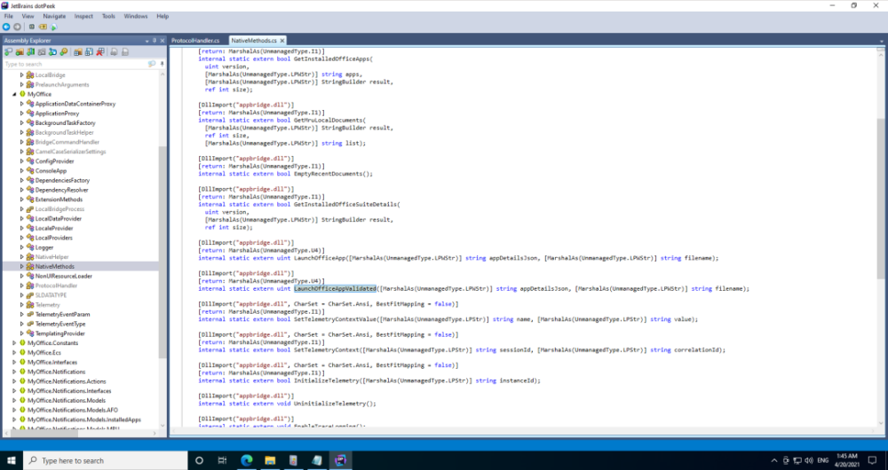 从“ AppBridge.dll” (dotPeek) 进口“ LaunchofficeAppValidad” 作为“ LocalBridge” 的反向来源 。